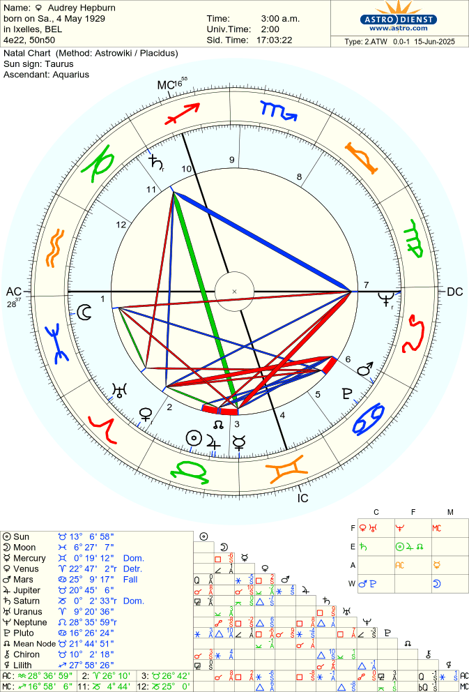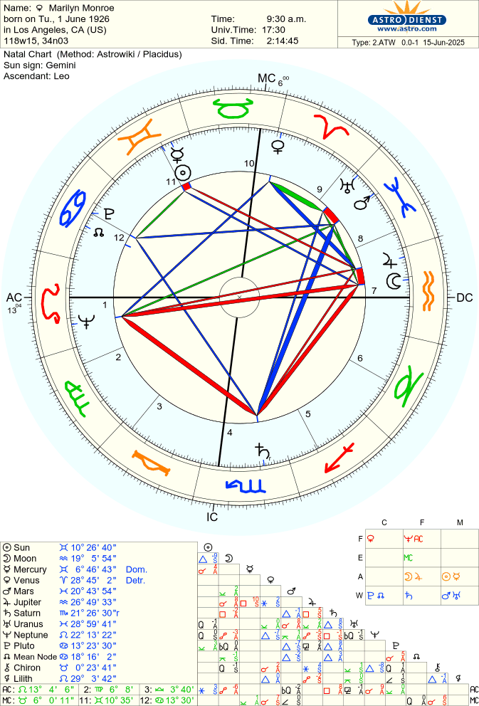 Birth charts of Marilyn Monroe (left) and Audrey Hepburn (right). Both have a rodden rating of AA.