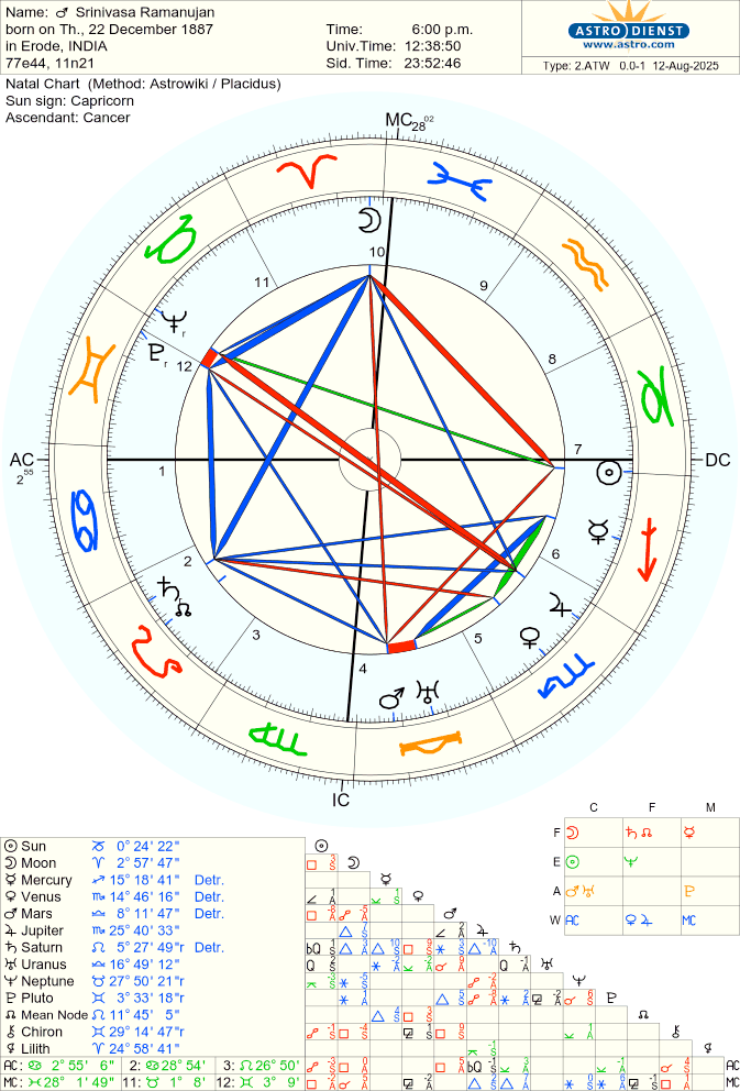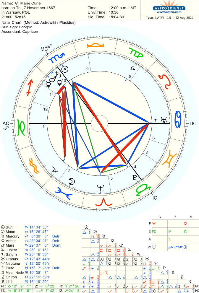 Marie Curie's birth chart, left (rodden rating AA), and Srinivasa Ramanujan's birth chart, right (rodden rating B)
